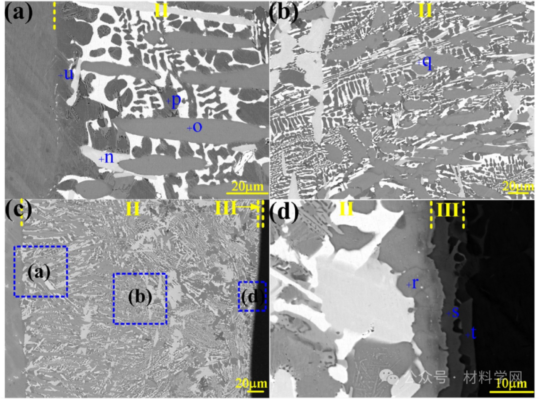 图5. 在1100°C/10分钟下,采用梯度复合填充金属(Ti21.25Zr25Ni25Cu18.75/Zr25V6.25Cu50Ni18.75)钎焊的TiAl金属间化合物/K4169合金典型显微结构:(a)、(b)和(d)为放大图像,对应于(c)中标记的区域。