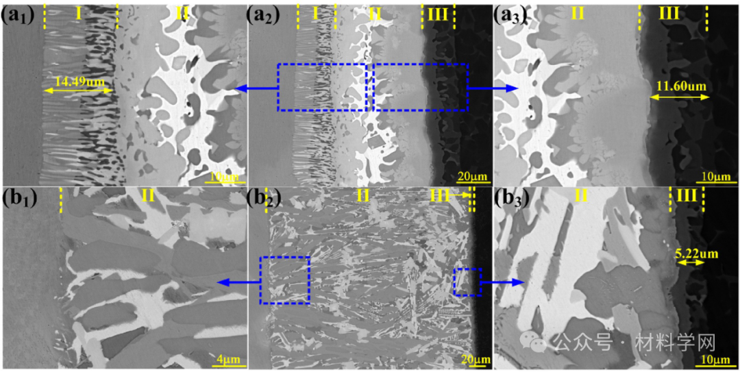 图4. 在不同钎焊温度(保温10分钟)下的K4169/(Ti21.25Zr25Ni25Cu18.75/Zr31.25V6.25Cu50Ni18.75)/TiAl钎焊接头的界面微观结构:(a1)–(a3) 1040°C;(b1)–(b3) 1070°C。
