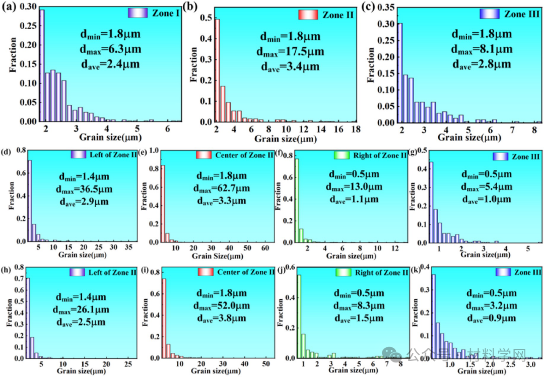 图12. 对1040°C和1100°C下采用GAFMs (Ti21.25Zr25Ni25Cu18.75/Zr31.25Cu50Ni18.75) 和 (Ti21.25Zr25Ni25Cu18.75/Zr25V6.25Cu50Ni18.75) 钎焊的K4169/TiAl接头的晶粒尺寸分布进行了测定:(a–c) 在1040°C/10分钟下采用(Ti21.25Zr25Ni25Cu18.75/Zr25V6.25Cu50Ni18.75) GAFM钎焊的接头;(d–g) 在1100°C/10分钟下采用(Ti21.25Zr25Ni25Cu18.75/Zr31.25Cu50Ni18.75) GAFM钎焊的接头;(h–k) 在1100°C/10分钟下采用(Ti21.25Zr25Ni25Cu18.75/Zr25V6.25Cu50Ni18.75) GAFM钎焊的接头。
