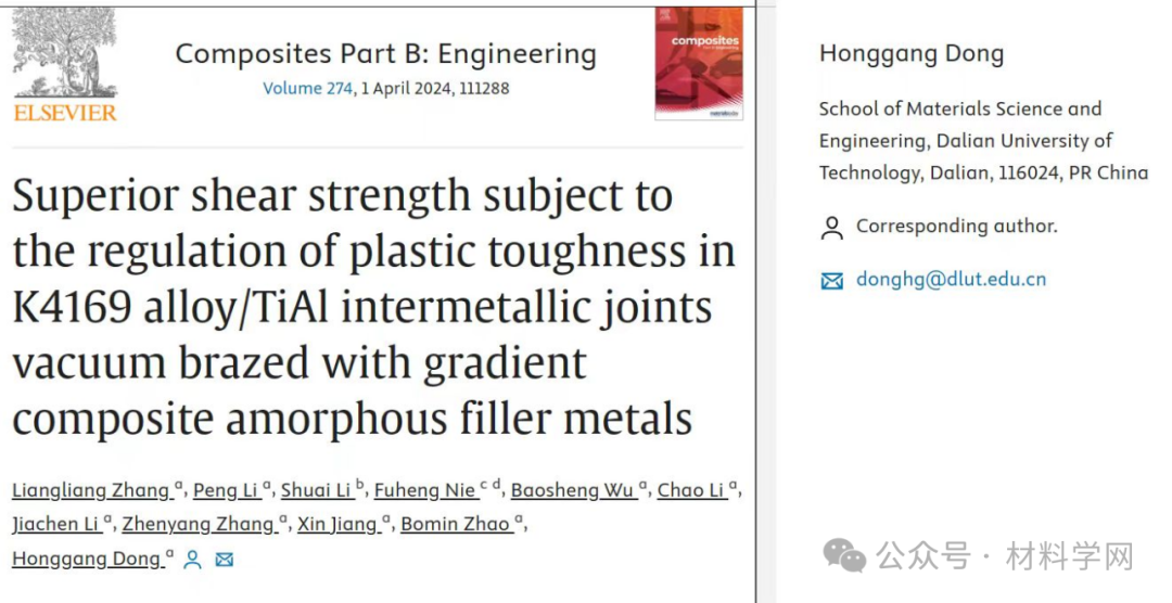 相关研究成果以“Superior shear strength subject to the regulation of plastic toughness in K4169 alloy/TiAl intermetallic joints vacuum brazed with gradient composite amorphous filler metals” 发表在Composites Part B上。