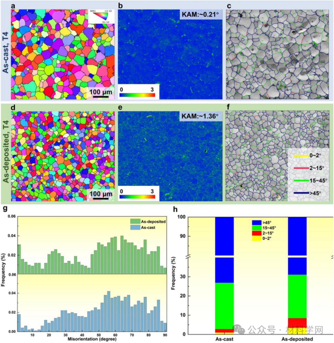 图3所示。铸造态和沉积态GW93K合金的EBSD结果:(a, d)晶粒形貌;(b, e) KAM地图;(c, f)不同取向角下的GBs分布。(g)和(h)为不同合金中不同取向角的gb的频率(%)