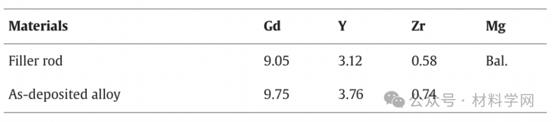 表2. 用电感耦合等离子体原子发射光谱(ICP-AES)测定了填充棒和沉积态GW93K合金的化学成分(wt.%)