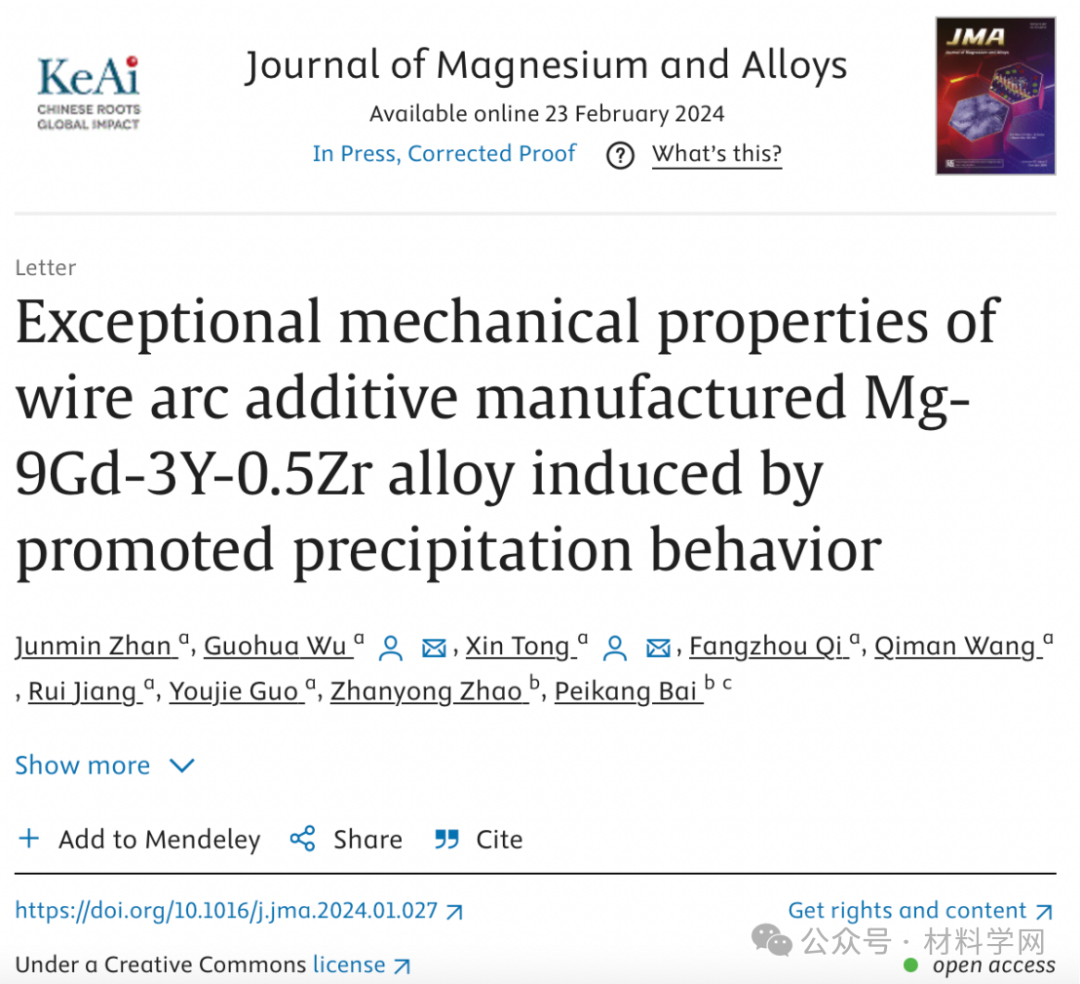 相关研究成果以“Exceptional mechanical properties of wire arc additive manufactured Mg-9Gd-3Y-0.5Zr alloy induced by promoted precipitation behavior”发表在 Journal of Magnesium and Alloys上。