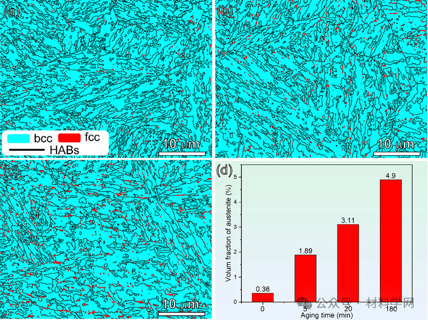 图2。IQ样品老化(a) 5 min, (b) 20 min, (c) 3 h的HABs相图,(d)奥氏体体积分数与时效时间的比值。