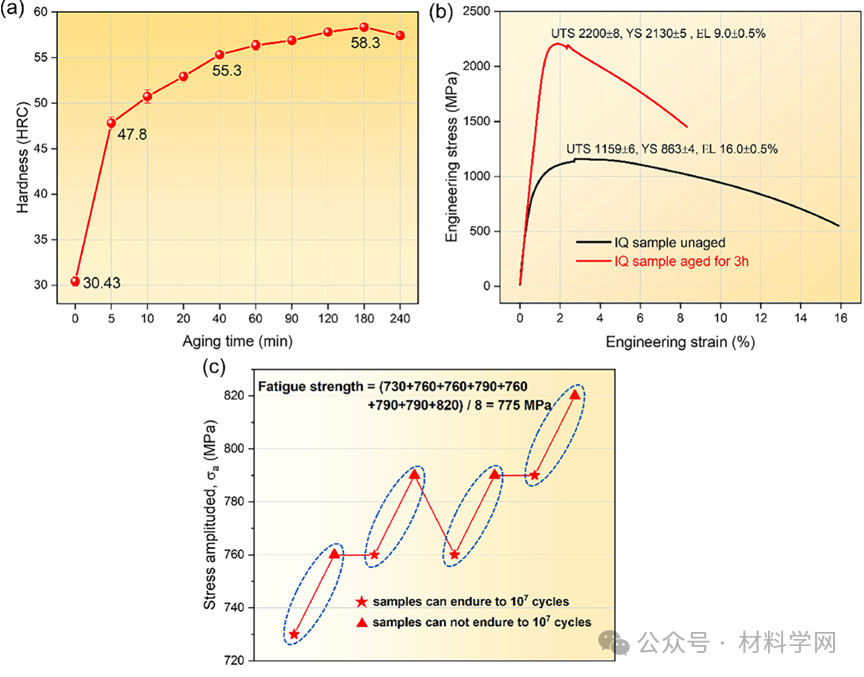图4。(a) IQ试样硬度随500℃时效时间的变化曲线,(b) IQ试样未时效和时效3 h的拉伸应力-应变曲线,(C) IQ试样时效3 h的疲劳强度阶梯图。