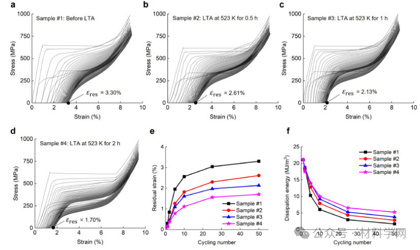 图 4 . (a-d)纳米晶Ti-50.9 at的循环应力-应变曲线。% Ni样品。(e)残余应变()随循环的演化。(f)耗散能随循环的演化。