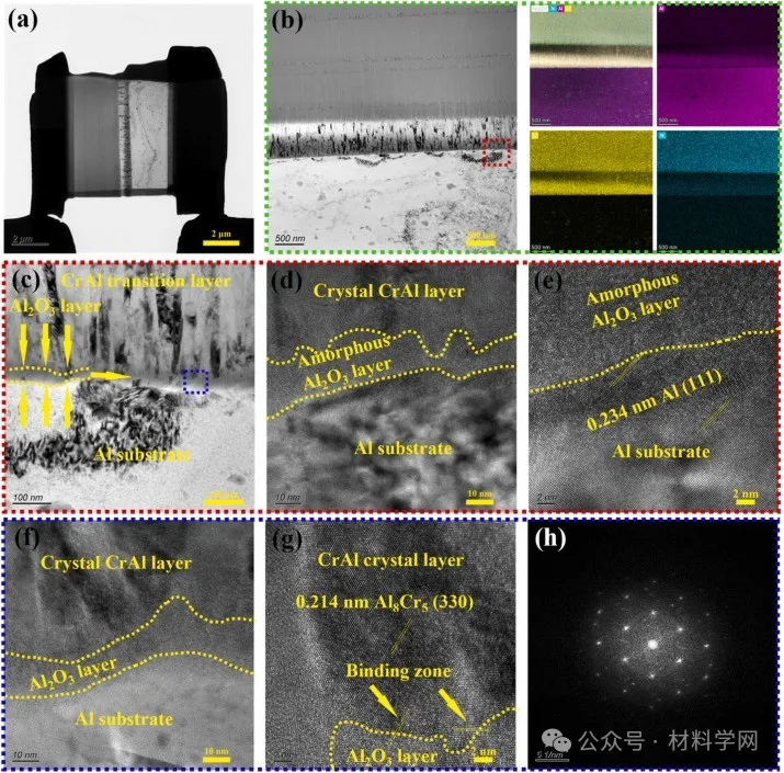 图 4 沉积在 Al 合金上的 N-3 涂层的 TEM 分析:(a)FIB 制备;(b、c)制备涂层的横截面 TEM 图像和相应的 EDS 元素图;(d、e、f、g)CrAl/Al 合金界面横截面的 HRTEM 图像,以及(h)相应的 CrAl 过渡层的 SAED 分析。