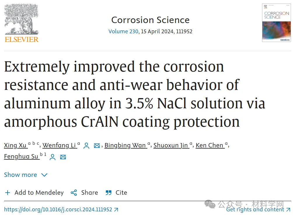导读:铝合金的低硬度和有限的抗磨性对其稳定性和使用寿命构成了障碍,尤其是在腐蚀性环境中。本文呢通过直流磁控溅射在铝合金上沉积非晶态 CrAlN 涂层。含氮量为 30.2% 的 CrAlN 涂层致密,可防止氧化物和腐蚀性液体的侵入,从而大大提高了涂层的防腐蚀性能。涂层铝合金在 3.5% NaCl 溶液中的磨损率降低了三个数量级。这项工作为在轻合金上构建非晶保护涂层铺平了道路。