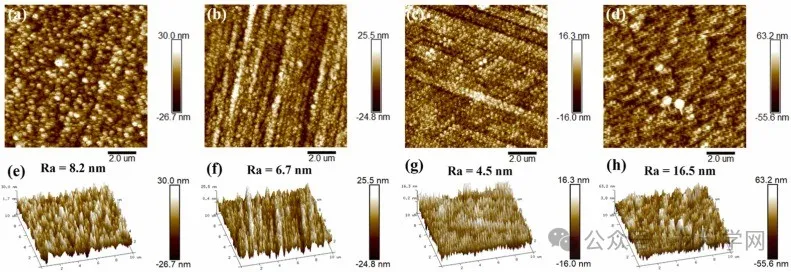 图 2 CrAlN 涂层表面形貌和相应粗糙度的原子力显微镜图像:N-1(a,e);N-2(b,f);N-3(c,g);N-4(d,h)。