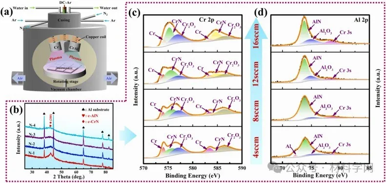 图 1 (a)沉积设备示意图;(b)不同氮含量的 CrAlN 涂层的 XRD 图样和(c、d)拟合 XPS 光谱。