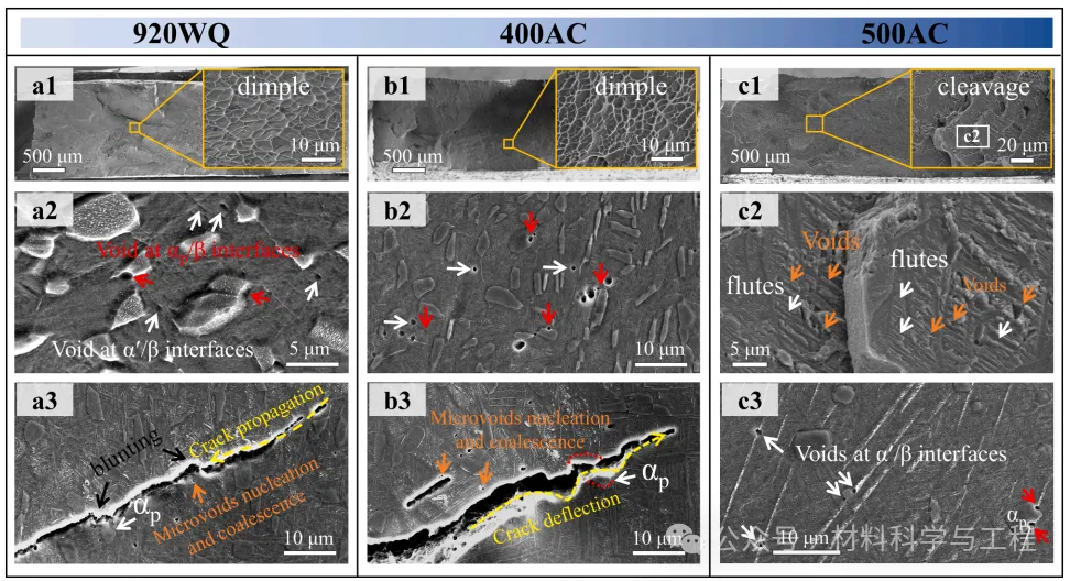 图 8. 不同状态下Ti-2.8Cr-4.5Zr-5.2Al 合金的断裂特征。(a1) WQ 样品断裂表面的扫描电镜显微照片。(a1) 中的插图是断裂表面的放大图像,其中有大量凹陷。(a2)断裂表面的 SEM 图像显示了 αp/β 和 α′/β PB 处的空隙。(a3)断裂表面的 SEM 图像显示裂纹沿 αp/β 和 α′/β PB 扩展/偏转。(b1)400AC 样品断裂面的 SEM 显微照片。(b1) 中的插图是断裂表面的放大图像,显示出大量凹陷。(b2)断裂表面的扫描电镜图像显示了αp/β 和 α′dec/β PB 处的空隙。(b3) 扫描电镜图像显示了裂纹沿 αp/β 和 α′dec/β PB 的扩展/变形。(c1) 500AC 样品断裂面的扫描电镜显微照片。(c1)中的插图是断裂表面的放大图像,显示出跨晶裂纹状特征。(c2) 扫描电镜图像显示,宏观劈裂面实际上是由不连续的微空洞(橙色箭头)和非常细的凹槽(白色虚线)组成。(c3) αp/β 和 α′dec/β PB处存在空隙的相应次表面显示,即使在相当靠近空隙的位置,也无法辨别塑性变形痕迹(空隙扩展或裂纹偏转)。