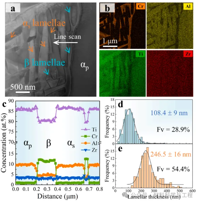 图 5. 700AC Ti-2.8Cr-4.5Zr-2.5Al 合金的微观结构特征。(a) HAADF-STEM 图像显示了 β 和 αs 纳米薄片。(b) EDS 图显示了 Cr、Al、Ti 和 Zr 的分布。(c) TEM-EDS 沿 a 中白线线扫描获得的 Cr、Al、Ti 和 Zr 浓度分布图。(d-e) 700AC 样品中 αs 和 β 薄片厚度的统计分布。