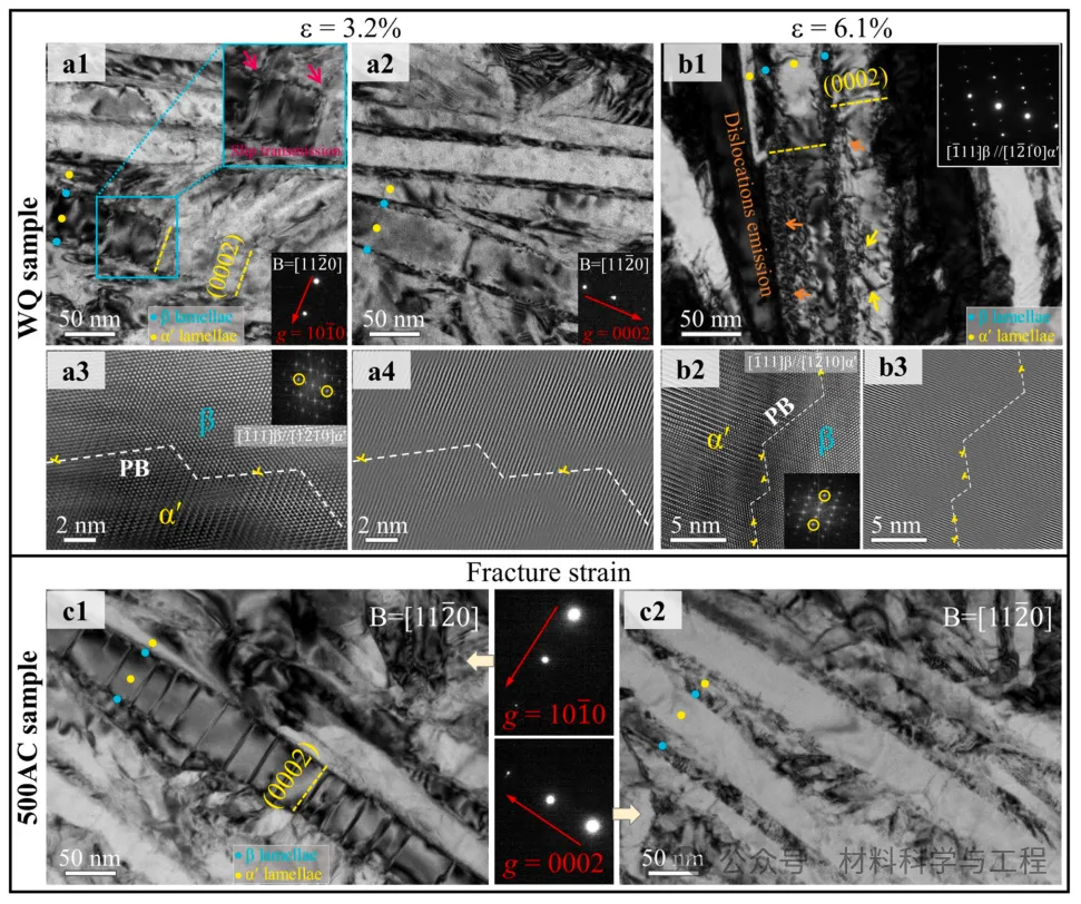 图 9. WQ 和 500AC Ti-2.8Cr-4.5Zr-5.2Al 合金的变形亚结构。(a1-a4) 变形量为 3.2 % 的WQ 样品。(a1-a2) WQ 样品中位错的两束条件分析。位错由α′/β PB 沿α′薄片内的基底(0002)滑移系统发出,黄色破折号线表示。(a1) 中方框区域的进一步放大显微照片显示了 PB 的滑移传输事件,通过粉红色箭头突出显示。(a3-a4)HR-TEM 和相应的IFFT 图像显示了 α′/β PB 处的几个 RID,验证了位错传输活动,RID 用黄色符号"⊥"标记。(b1-b3)WQ 样品变形了 6.1%。(b1) TEM 图像显示,α′薄片内部的位错密度和位错相互作用(黄色箭头)较高。除了 (0002) 滑移系统外,许多差排还从相干的 PB 中成核,如橙色箭头所示。b1)中的插图是相应的选区电子衍射(SAED)图。(b2-b3)HR-TEM 和相应的IFFT 图像显示了 PB 上更多的 RID。(c1-c2)断裂应变时 500AC 样品中位错的两束条件分析。只有沿(0002)平面的滑移带被激活。