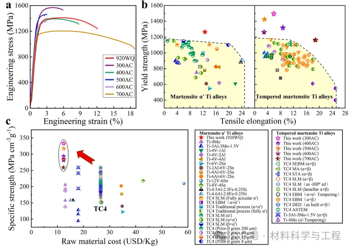 图 6. 本研究的Ti-2.8Cr-4.5Zr-5.2Al 合金的室温机械性能。(a) 本研究的钛合金在不同状态下的工程应力-应变曲线。(b) 本钛合金的屈服强度与总伸长率的对比,以及迄今为止报道的其他马氏体α'和回火马氏体α′钛合金的屈服强度与总伸长率的对比。马氏体 α′ Ti 合金:包括 Ti-4Mo、Ti-5Al-3Mo-1.5V、Ti-V-(Al,Sn)系列、Ti-V-Sn 系列、Ti-4.5Al-(2.0-2.5)Fe-0.25Si、TC4(不同先β晶粒尺寸)和 TC4-SLM (α′) 系列;回火马氏体 α′ Ti 合金(包括部分分解 α′ 相或完全分解 α′ 相):TC4-SEBM、TC4-MA、TC4-传统工艺、TC4-STA、TC4-SLM(α+β)、TC4-SLM(片状α+β)、TC4-EBM(α′+β回火)和TC4-EBM 及 TC4-EDE、TC4-SLM(作为 HIP′ ed)。(c) 本研究的钛合金与其他已报道的强α′/β钛合金的比屈服强度与原材料成本的比较。