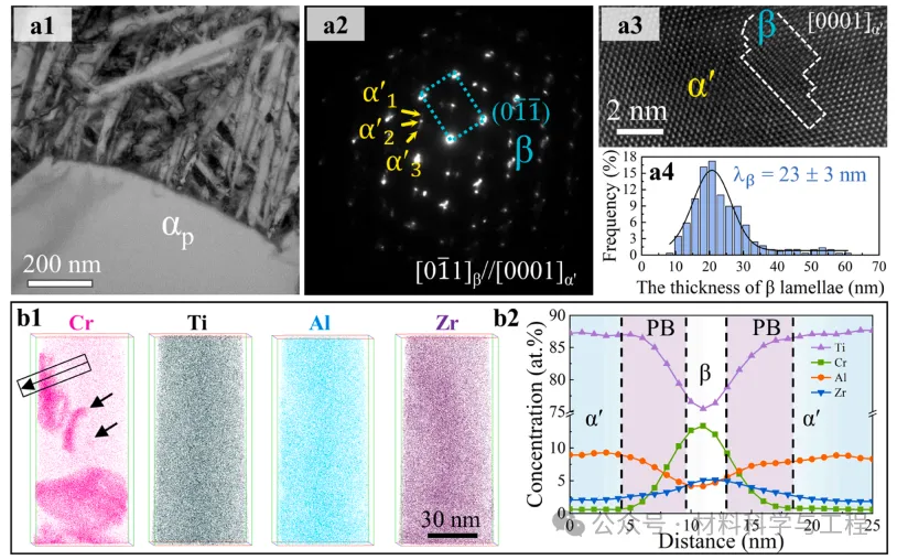 图 3. 400AC Ti-2.8Cr-4.5Zr-5.2Al 合金的微观结构特征。(a1) BF-TEM 显示了 αp 和 α′dec 相。(a2) β-transus 显微结构的 SAED 图形显示了三种马氏体变体。(a3) HR-TEM 图像显示了 α′ 马氏体内部的 β 纳米粒子。(a4)400AC 样品中 β 层厚度的统计分布。(b1-b2)对400AC 样品的元素分配和成分进行的 APT 分析显示,α′位错马氏体中富含钙的 β 纳米粒子,如黑色箭头所示。
