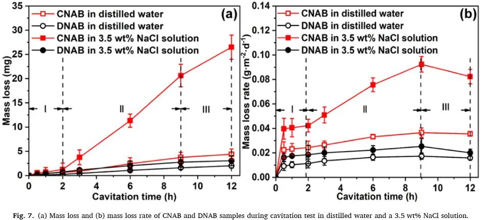 图7显示了在蒸馏水和3.5 wt% NaCl溶液中空化不同持续时间的样品的质量损失和质量损失率。如图7所示,在蒸馏水和3.5wt%NaCl溶液中,两个样品的质量损失随着持续时间的增加而增加。CNAB的质量损失大于DNAB。图7a显示了随着持续时间增加的质量损失阶段,可分为初始期(指定为I期)、上升期(指定为II期)和稳定期(指定为III期)。前2小时的质量损失较低,与初始期一致。从2 h到9 h,质量损失大大增加,这是空化侵蚀的上升期。9小时后,质量损失持续增加。然而,增加速度减慢,达到空化侵蚀的稳定阶段。每个样品的质量损失率如图7b所示,可以观察到,无论蒸馏水还是NaCl溶液,DNAB的质量损失率都低于CNAB。此外,所有样品的质量损失率在I期缓慢上升,在2~9 h时迅速上升,在9 h时达到最大值,并在9~12 h时缓慢下降到平台期。暴露12 h后,DNAB在蒸馏水和NaCl溶液中的质量损失率分别比CNAB低55.27%和74.77%。