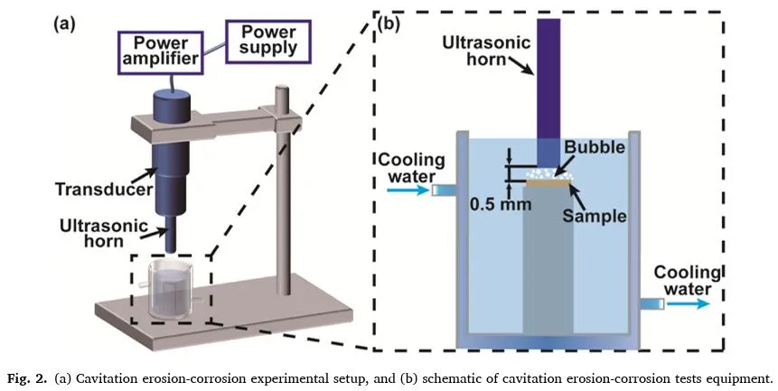 图2a显示了用于气蚀侵蚀试验的设备。在蒸馏水和天然3.5 wt% NaCl溶液中进行空化侵蚀试验。用去离子水和分析级NaCl粉末制备3.5 wt% NaCl溶液。实验采用符合ASTM G32标准的振动超声仪器。设备的原理图如图2b所示。将样品放在载体台上,将溶液倒入浸没样品中,使溶液表面距离样品表面15 mm。超声波喇叭在超声波驱动下剧烈振动,溶液中产生许多气泡。该设备模拟了对材料的冲击和剥离效果。根据参考文献,在空化时间达到9小时后,质量损失率通常趋于稳定。因此,选择12小时作为结束时间。使用20 kHz的超声波喇叭频率和50 μm的双振幅(峰峰值)进行空化侵蚀试验,持续不同持续时间(1、3、6、12 h),以研究空化侵蚀过程中样品的变化。连续流动的冷却水将溶液保持在(25±0.2) ℃。