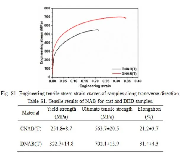 (2) 虽然DNAB的残余应力略高于CNAB,但CNAB样品中的β′相和粗κ相更有利于裂纹的产生和扩展。因此,与CNAB相比,DNAB样品的极限拉伸强度提高了约27.76%,伸长率提高了54.89%。