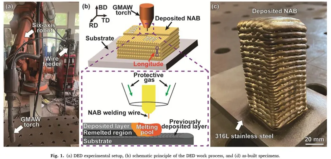 DED的实验装置包括六轴机器人、具有冷金属转移(CMT)模式的气体保护金属电弧焊(GMAW)割炬和送丝机,如图1a所示。原材料为商用NAB焊丝,符合AWS A5.7 ERCuNiAl标准,直径为1.2 mm(化学成分为:8.90 wt% Al、3.90 wt% Fe、1.10 wt% Mn、4.30 wt% Ni和Cu平衡)。以化学成分为8.72 wt% Al、3.31 wt% Fe、1.49 wt% Mn、4.38 wt% Ni和Cu天平的铸造NAB合金(C95800)作为参考金属。