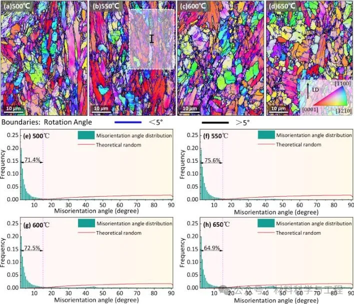 图3 双态组织不同高温断后试样侧面IPF图及其对应的取向角分布柱状图