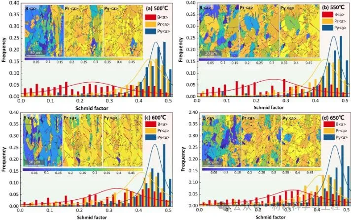 图4 双态组织不同拉伸温度下施密特因子分布及滑移迹线