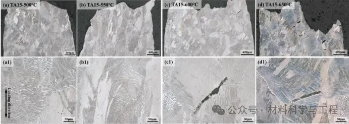 图2魏氏体组织在不同高温拉伸后的断后侧面金相照片
