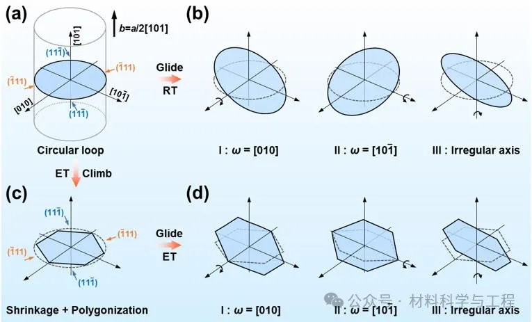 为了理解位错环的取向分布特征及其偏转驱动力,研究团队基于位错弹性应变能计算得到图7所示位错环的能量E在偏转角φ = 0° - 40°范围内的变化,发现偏转角在0° - 20°范围内位错环的应变能E随偏转角φ的增大而增加的程度较为缓慢,表明纯刃位错环的取向相对于其{110}惯习面在小角度范围内相对容易发生偏转,计算结果与偏转角的分布特征相吻合。综合位错环三维定量表征和原位加热实验结果,研究团队揭示了位错环取向的偏离机制(图8)。具体而言,在室温或低温下,位错环主要通过靠近{111}滑移面的四段局部位错在以环为底、Burgers矢量为轴的柱面上相互协同运动,导致了三种以不同方向为轴偏离其惯习面的位错环。高温下,位错的攀移运动机制被有效激活,此时位错环发生收缩和多边化,使其四个位错段靠近{111}滑移面分布,进而在四个靠近{111}滑移面的位错段持续竞争和协同运动下形成具有三种取向偏转行为的偏离惯习面的位错环。