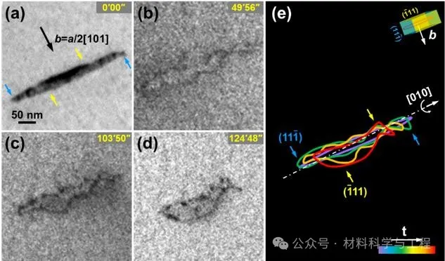 研究团队将位错晶体学三维重构方法与透射电镜原位加热技术相结合,耦合分析了三类偏转位错环的晶体学特征与动态演化行为之间的内在联系(图4-6)。结果表明,位错环在热场下发生了不均匀的收缩,并呈现出明显的多边形特征。将位错环的动态行为与局部位错的组分和偏离特征进行耦合分析,清晰地表明了位错环的各向异性收缩行为受到局部位错段组分以及相对各自滑移面偏离程度的共同影响。具体来说,含有较多刃位错分量和靠近滑移面{111}的位错段在热场下收缩得更为迅速,且倾向于在(-111)、(11-1)、(010)和(10-1)等晶面平直分布。从edge-on方向原位观察发现,靠近滑移面的位错段优先发生弓出,且弓出程度随着时间延长更加明显,最终导致位错环进一步偏离其惯习面(图6)。通过将位错环的动态演化过程与位错晶体学特征分布进行耦合分析,可确定发生弓出的位错段实际上为刃型组分含量较多和靠近(-111)和(11-1)滑移面的位错段。