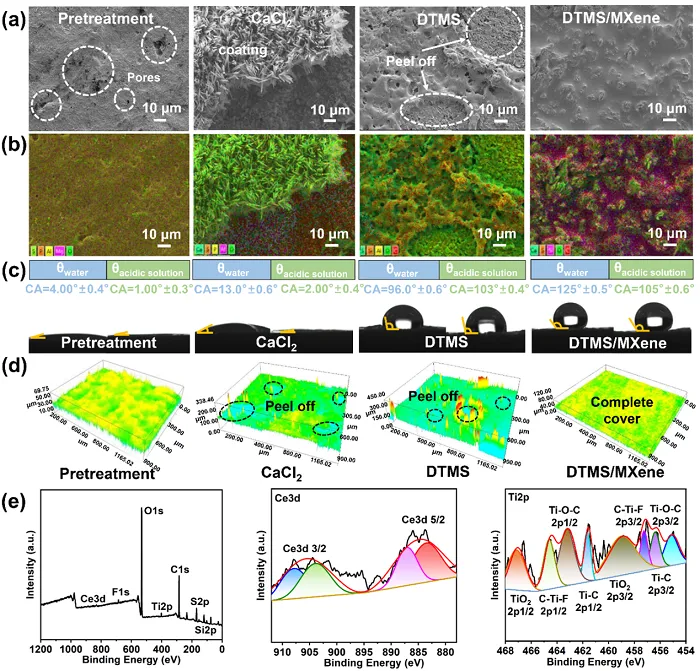 在酸性溶液中浸泡后,对比样品涂层表面出现明显孔洞和剥离,MXene复合涂层仍呈现完整覆盖。同时,润湿性测试表明MXene复合涂层对水和酸性液体仍呈现高疏水性。表面化学组成分析结果说明Ce3+和MXene在涂层腐蚀防护中起到关键作用。