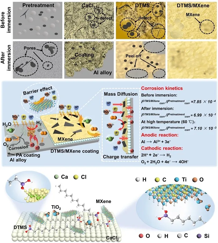 图6 MXene复合涂层在酸性条件下浸泡前后形貌变化及防腐机制
