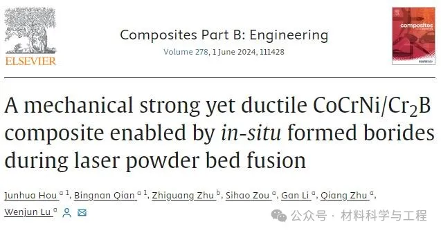 近日,南方科技大学机械与能源工程系逯文君研究员和朱强教授团队,联合南京理工大学朱志光教授,成功利用激光增材制造技术(LPBF)开发出一种高强韧的中熵合金复合材料,并将其研究成果发表在复合材料领域顶级期刊《Composites Part B: Engineering》上。该论文题为“A mechanical strong yet ductile CoCrNi/Cr2B composite enabled by in-situ formed borides during laser powder bed fusion” (利用激光粉末床熔融过程中原位形成的硼化物使得CoCrNi/Cr2B复合材料具备了高强韧性),该期刊为中科院一区TOP期刊,其影响因子为13.1。