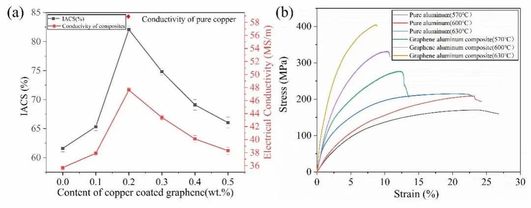 实验结果表明,所制备的铝石墨烯复合材料的界面产物中没有铝碳相,主要为Al2Cu。复合材料的电导率可达82.5%IACS(纯铜为100%IACS)(图2),相当于标志性铜铬锆高强高导铜合金的导电性。抗拉强度可达404MPa,约为退火纯铜的两倍(图2)。相比于同样条件下制备的纯铝,强度提高了68%,导电性提高了33%。