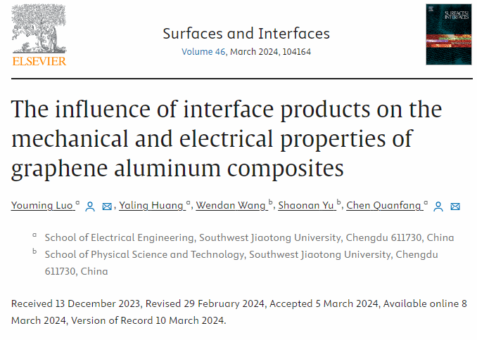 近日,西南交通大学电气工程学院陈全芳教授团队在高导高强石墨烯铝复合材料领域取得重要进展,相关研究成果以西南交通大学为第一单位,以“The influence of interface products on the mechanical and electrical properties of graphene aluminum composites”为题,发表在国际知名期刊《Surfaces and Interfaces》上。西南交通大学为论文唯一单位,西南交通大学电气工程学院博士研究生罗友明为论文的第一作者,西南交通大学电气工程学院陈全芳教授为该论文的通讯作者。