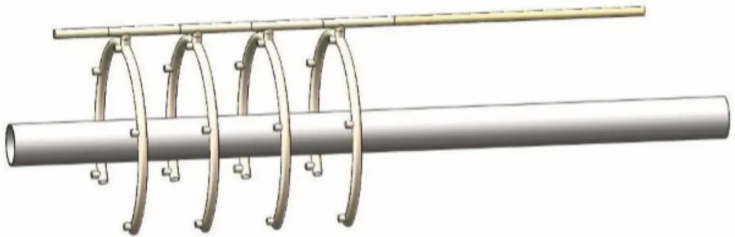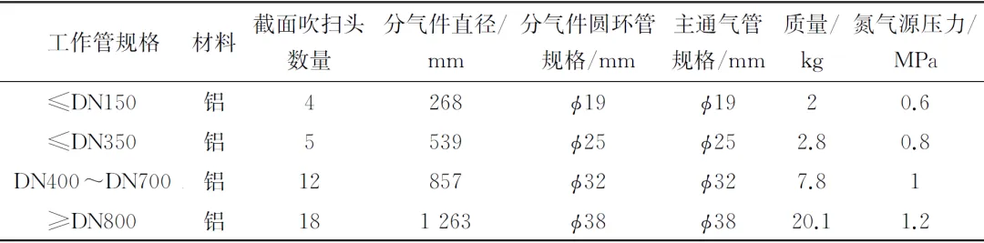 通过对LNG低温管道保冷系统在线修复工具进行参数设计,并委托具备加工资质的厂家对修复工具进行加工(以某LNG接收站现场88.5 mm槽车返回管线的部分管段作为试验管段,故修复工具设计尺寸选取≤DN150 mm),为了方便修复工具更好地覆盖低温管道,将该修复工具设计成270°圆弧结构,根据吹扫参数计算吹扫管道圆周所需的吹扫头数量。该工具共有4个圆弧形吹扫截面,每两个截面间隔200 mm,每个圆弧截面上设置5个吹扫头,4个圆弧吹扫截面根据需要自由组合成3个截面、2个截面、1个截面单独使用。