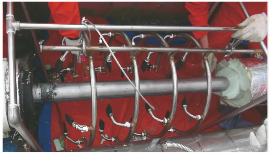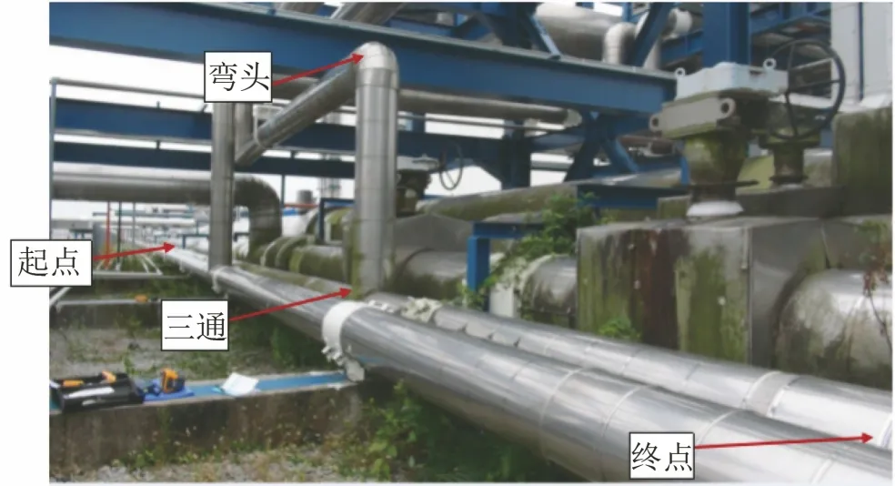在某LNG接收站现场88.5 mm槽车返回管线(共计约30 m)进行保冷系统在线修复工程应用,该段管道包括管托、三通、竖直管道、弯头等特殊管件(见图4),施工过程中借助LNG低温管道保冷系统在线修复工具有效地去除了LNG低温管道表面的冰霜(见图5),并在施工前后对该管段保冷效果进行检测评估。
