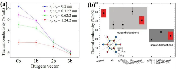 图8所示。热导率受(a) Burgers矢量和(b)位错类型的影响。