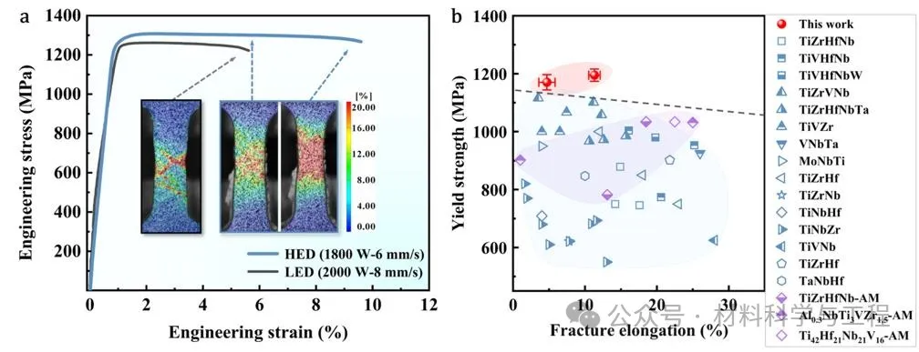 图2 增材制造TiVHfNbMo合金的室温拉伸工程应力-应变曲线及屈服强度-延伸率对比