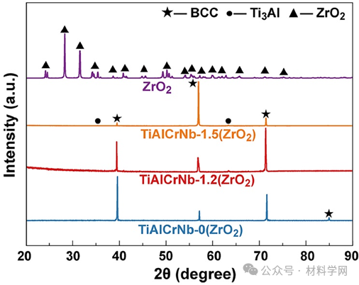图1. ZrO2粉末以及TiAlCrNb-0/1.2/1.5(ZrO2) 中熵合金的XRD图谱