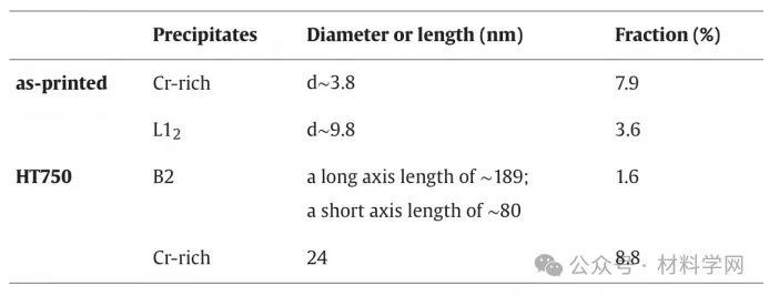 表2。打印样品和HT750样品中析出物的体积分数和大小。
