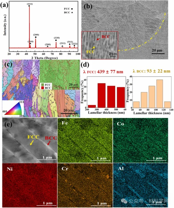 图2所示。打印样品的相组成和微观结构。(a) XRD谱图显示FCC相和BCC相的存在;(b)纳米层状结构的SEM图像。没有发现初级相。黄色虚线表示熔池边界。插图是高倍率的扫描电镜图像;(c) EBSD-IPF图。附图为相应的ebsd相图,FCC片为绿色,BCC片为红色;(d) FCC和BCC片层厚度分布;(e) STEM-EDS图谱,FCC片层富含Fe、Co和Cr元素,BCC片层富含Ni和Al元素。