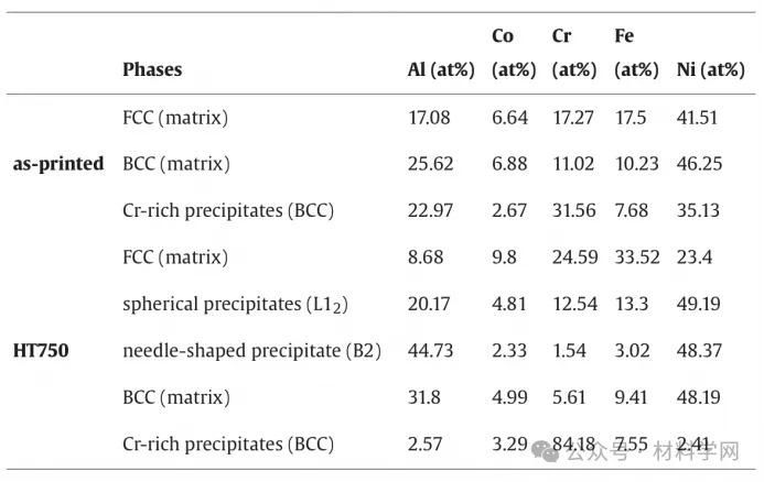 表1。通过STEM-EDS图谱对打印样品和HT750样品进行化学分析。