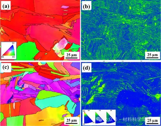 图3 不同状态下IN718高温合金纵截面EBSD图: (a)和(b)沉积态; (c)和(d)HT-1