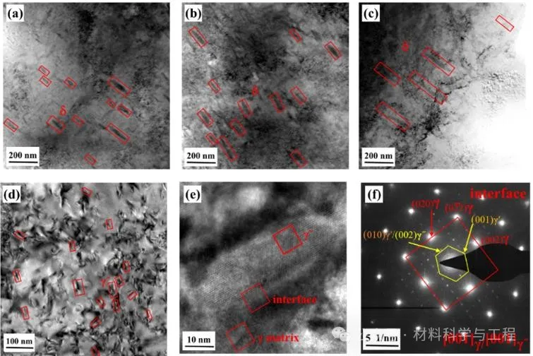 图5不同状态下IN718析出相的TEM图: (a)HT-1, (b)HT-2, (c)HT-3, (d),(e)和(f) HT-4