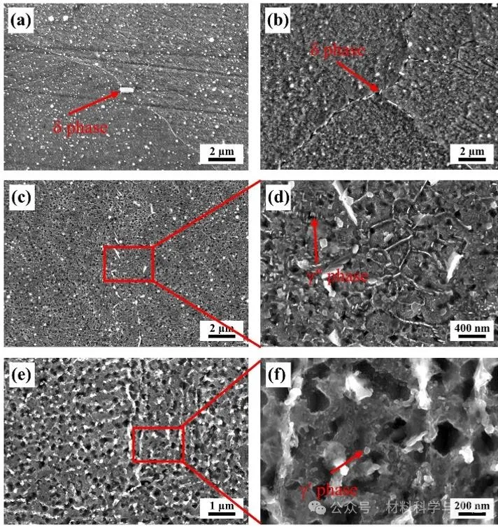 图1 不同热处理条件下IN718高温合金的SEM图: (a) HT-1, (b) HT-2, (c) 和 (d) HT-3, (e) 和 (f) HT-4