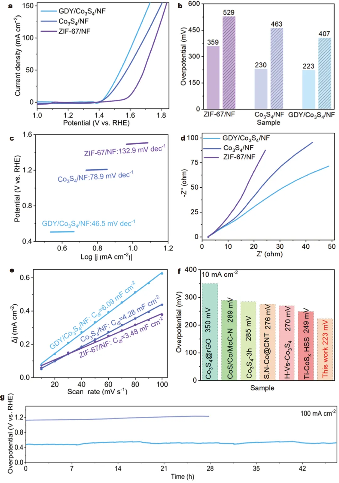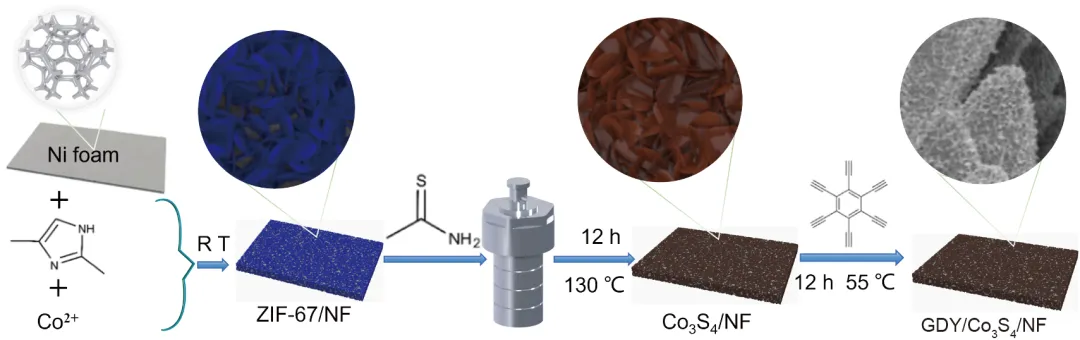 近日,天津理工大学鲁统部教授和王梅副教授等人在Science China Materials发表研究论文,基于石墨炔(GDY)独特的可控合成特性,将其原位复合在MOF衍生的Co3S4/NF材料上,获得了自支撑电极GDY/Co3S4/NF,大大提高了其OER催化性能。