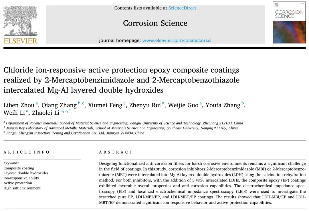 海洋腐蚀介质中含有大量的 Cl-、 SO42-、 Na+、 Mg2+和 Ca2+等离子,若腐蚀介质中的上述离子与涂层中无机载体材料接触后使后者发生刺激性响应并释放出缓蚀剂,则可实现涂层的自修复。近年来,镁铝层状双金属氢氧化物(LDH)因其片状阻隔作用被广泛应用于金属腐蚀防护领域。同时,负载阴离子缓蚀剂的LDH与腐蚀介质中的阴离子具有明确的离子交换能力。海洋环境中Cl-含量较高,基于负载有机缓蚀剂LDH的聚合物防腐涂层表现出Cl-刺激响应的巨大潜力,正受到海洋防腐自修复涂层研究者的高度关注。基于上述背景,江苏科技大学材料科学与工程学院李照磊课题组提出了一种新的解决方法和思路,通过煅烧再水合法制备了有机缓蚀剂 MBI 和 MBT 插层的镁铝水滑石(LDHs),再掺杂到环氧树脂(EP)共混,制备出了一种可通过离子刺激响应进行自修复且具有强抗腐蚀性能的复合涂层(图1)。该研究成果以“Chloride ion-responsive active protection epoxy composite coatings realized by 2-Mercaptobenzimidazole and 2-Mercaptobenzothiazole intercalated Mg-Al layered double hydroxides”为题,发表在国际腐蚀领域顶级期刊Corrosion Science上,江苏科技大学材料学院为该论文的第一完成单位,材料学院23届硕士毕业生周立犇为该论文的第一作者,李照磊为唯一通讯作者。