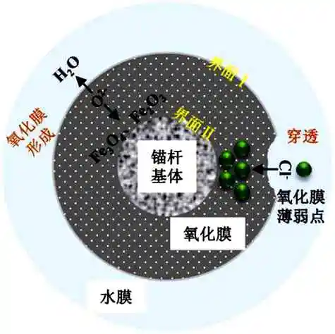 矿井腐蚀环境中金属锚杆主要经历3个腐蚀过程:①矿井水附着于金属锚杆表面发挥电解质作用,诱导金属锚杆发生电化学腐蚀;②矿井水中侵蚀介质破坏金属锚杆表面氧化膜,诱导金属锚杆点蚀形核生长;③矿井围岩应力与腐蚀环境协同作用,诱导金属锚杆应力腐蚀开裂。