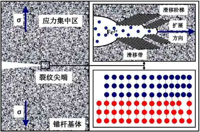 金属锚杆在腐蚀介质中发生化学反应产生微裂纹和H2,氢原子沿金属晶面扩散产生晶面间局部应力集中,从而导致晶面位错发射形成塞积群。氢原子和局部应力的软化作用使应力腐蚀裂纹在晶面位错塞积处不断形核,致使滑移面和解理面张开,应力腐蚀裂纹沿位错晶面扩展[50]。然而,该模型的应力腐蚀裂纹扩展机制还有待完善,不适用于解释无位错晶面处应力腐蚀裂纹扩展现象[51]。