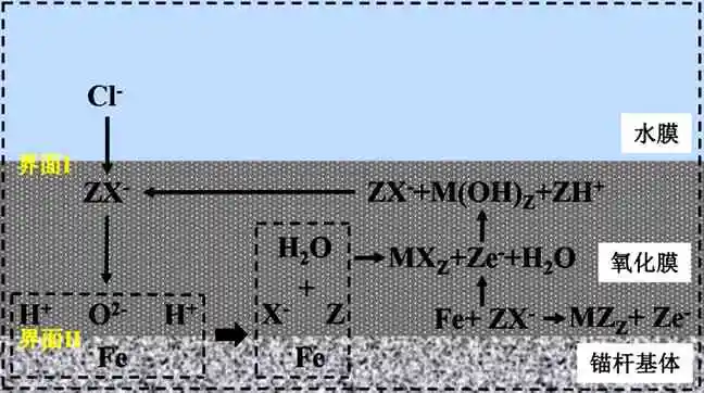 吸附模型示意图见图5。在吸附模型中,侵蚀性阴离子和氧化膜中阴离子(O2-、OH-)在金属锚杆表面存在竞争吸附现象[41]。Cl-穿透界面Ⅰ进入氧化膜中形成氯的络合离子(ZX-),一部分ZX-与Fe反应生成Cl-;一部分ZX-因具有强于O2-和OH-的吸附性而夺取锚杆表面更多的吸附点,并形成可溶性金属-羟基-氯络合物(MXZ)破坏氧化膜。MXZ进一步与Cl-反应生成ZX-,ZX-浓度的升高使氧化膜加速破坏,导致锚杆表面点蚀形核[42]。该模型解释了氧化膜与基体金属之间(界面Ⅱ)的Cl-存在现象,但仍有其局限性,无法解释形核中心集中出现于某些特殊位置(如金属表面杂质处)的现象。