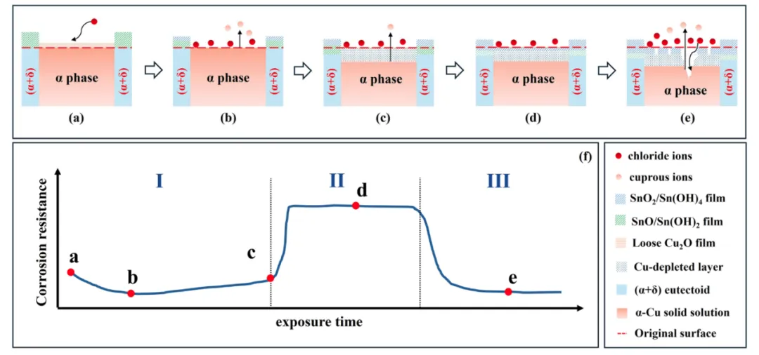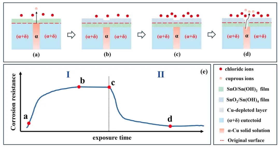 缓蚀和封护是青铜文物保护处理的重要环节,长期以来,青铜文物缓蚀、封护材料研发工作聚焦于提升缓蚀、封护材料的长期防护性能,却往往忽略了其可逆性问题,这导致很多具有优异性能的缓蚀、封护新材料在文物保护具体实践中难以落地使用。需要注意的是,尽管缓蚀、封护材料的使用可有效延缓青铜文物腐蚀劣化,但却也不可避免地会向器物本体引入外来物质,对器物中蕴含的考古信息造成干扰。由此,寻找最小干预原则和最佳保护效果之间的平衡是文物保护研究需要关注的重点问题。 针对上述问题,中国科学院大学研究团队基于青铜文物光致腐蚀机理相关前期研究成果,提出了一种基于光致钝化机制的青铜文物腐蚀防护新策略,可通过紫外光照射促进青铜表面锈层中致密SnO2钝化膜的形成,从而显著抑制青铜基体腐蚀。基于光致钝化机制对带锈青铜样品进行缓蚀处理的缓蚀效率可达93%,与常见青铜文物有机缓蚀剂效果相当。值得注意的是,该过程仅需光照等参与,形成SnO2钝化膜所需的Sn元素来源于器物本体,不会向器物本体引入外来物质,且钝化膜厚度仅为几十纳米,对锈层成分无明显影响,最大程度满足了文物保护的最小干预原则。总而言之,这项研究一定程度上解决了青铜文物保护工作中最优保护效果和最小干预原则不可兼得的矛盾问题,为青铜文物腐蚀防护技术的研发提供了新思路。相关研究成果,近期以Photo-induced passivation: A new corrosion mitigation strategy for bronze artefacts为题发表于材料腐蚀领域国际顶级学术期刊Corrosion Science。 图1 不同锡含量铸态Cu-Sn-Pb合金在避光及紫外光照射下的极化电阻变化规律 (a) Cu5Sn, (b) Cu10Sn, (c) Cu15Sn, (d) Cu20Sn 图2 低锡青铜光致腐蚀机理示意图 图3 高锡青铜光致腐蚀机理示意图 图4 光致钝化处理对带锈青铜样品的缓蚀效果 来源:中国科学院大学人文学院 原文链接: https://authors.elsevier.com/a/1jf23,Fwi-ST9